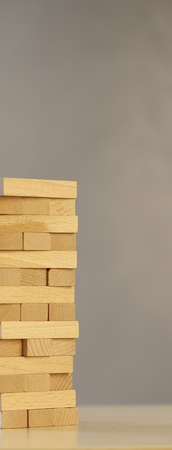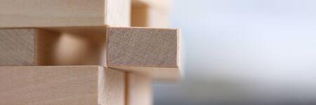 Close-up wooden blocks stacked in construction. Realization ideas and development abilities. Quality control process completing task. Model maintaining control over important matters