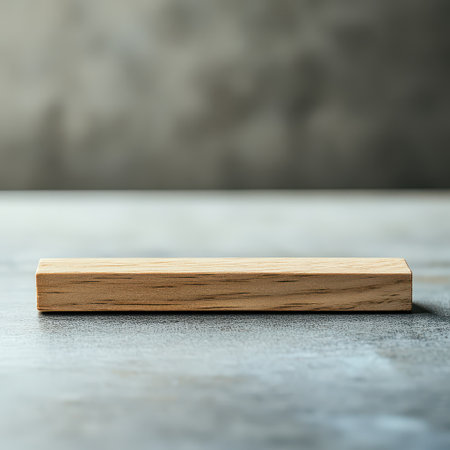 A smooth wooden block rests on a gray textured surface showcasing its natural grain and lines in a minimalist display of design and material.