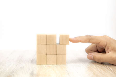 Close-up hand chooseing cube wooden block toy stacked without graphics for Business design concept and activity for children play and practices foundation stage.