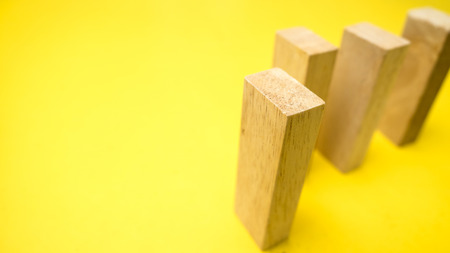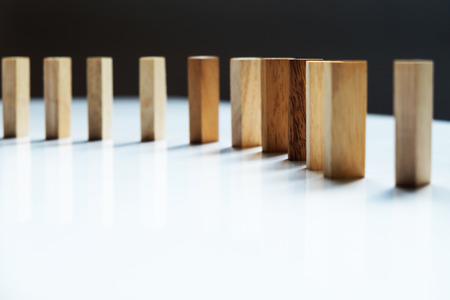 Business risk management concepts. Wooden block stop falling of other pieces of domino effect.