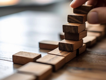 Close-up hand is placing wood block tower stacked in stair step with caution to prevent collapse or crash concepts of financial risk management and strategic planning.