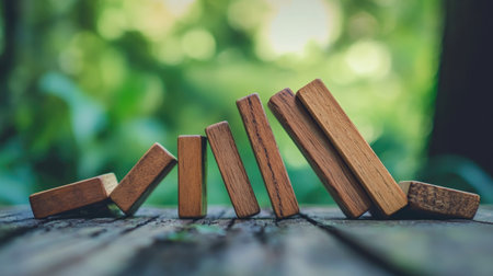 Dominoes with Dollar Signs Toppling on Wooden Surface Symbolizing Economic Impact