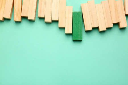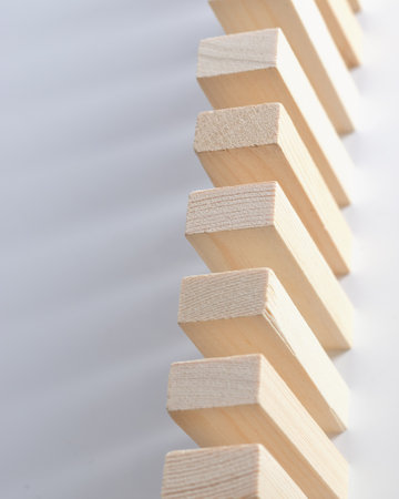 Man drops wooden blocks in row as fence via one, hand closeup view. Falling blocks in a row.