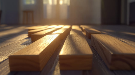 A collection of wooden pieces precisely arranged on a smooth surface, illustrating harmony and steadiness in a calm, even lit environment.