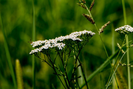 Achillea millefolium (yarrow) white wild flower on green meadow