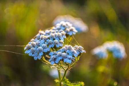 Medicinal wild yarrow grass during flowering, close-up at sunset in a field