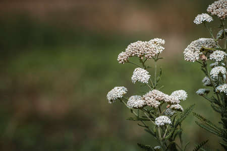 Medicinal plant yarrow, Achillea millefolium, white flowers close-up, selective focus.