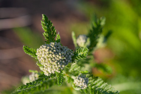 yarrow, gordaldo, nosebleed plant, old man's pepper, devil's nettle, milfoil or thousand-leaf in a garden in a sunny spring day