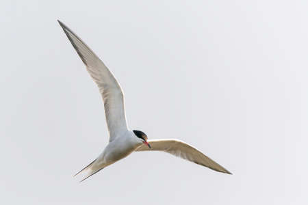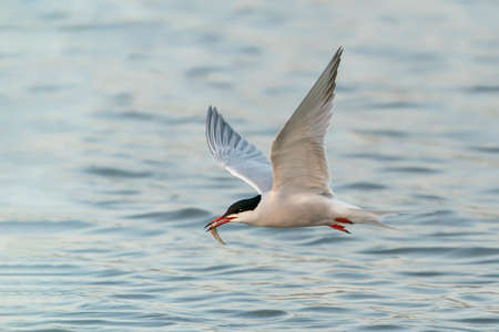 Common Tern (Sterna hirundo) in flight with a fish in its beak