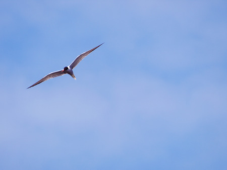 Adult common tern in flight on the blue sky background. Close up, front view. Scientific name: Sterna hirundo