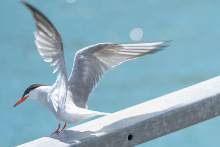 A Common Tern On A Railing With Sea In The Background, Taking Flight, Landscape Orientation