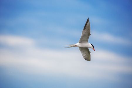 Turn with spread wings in flight. front view. Blue sky and sea waves in the background. Adult common tern in flight. Sterna hirundo. Natural habitat, summer season. Ladoga Lake