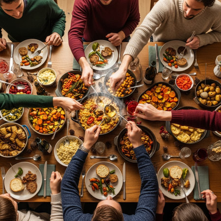 Top view of a group of people having dinner together at home.