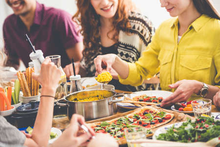 Friends Happiness Enjoying Dinning Eating Concept. Food Buffet. Catering Dining. Eating Party. Sharing Concept. close-up