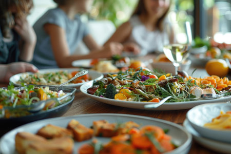 An inviting dining setup showcasing a variety of dishes on a wooden table. Vibrant colors and generous portions create a warm, communal dining experience.