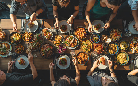 A high angle shot showcases a large wooden table laden with colorful and diverse dishes perfect for sharing among a group of friends at a stylish brunch The image captures a lively atmosphere as people interact with the food and each other promoting connection and joyful moments over a meal celebrating togetherness and vibrant flavors