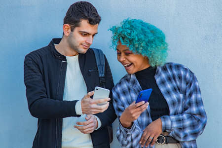 young couple looking at phones on the street