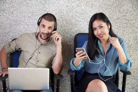 With smartphones in hands. Group of young people in casual clothes have a rest in the modern office.