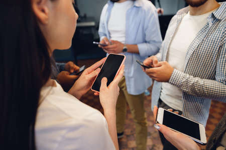Business people using mobile phones together standing in office. Close up shot of human hands holding smartphones. Blurred image. Selective focus on female hand in foreground.