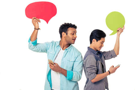 Handsome young men with speech bubbles are using phones. Afro American man is peeping