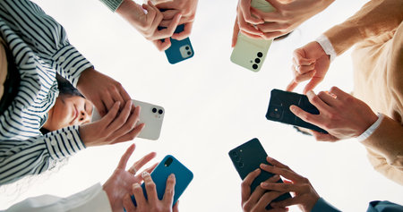 All together and connected. unrecognizable people using smartphones outside.