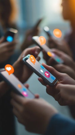 Group of friends interacting through smartphones with visible social media notifications. Community and connectivity focus.