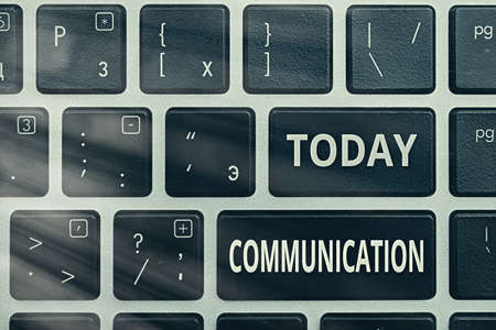 Handwriting text Communication. Conceptual photo a system whereby information is exchanged between individuals Pc keyboard key with empty note paper above background copy space