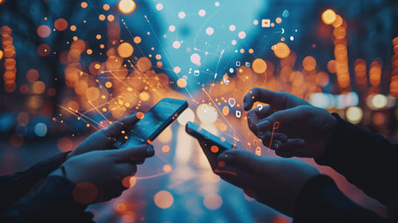 Double exposure of four young people using mobile phones together while standing together with connection network and night city background