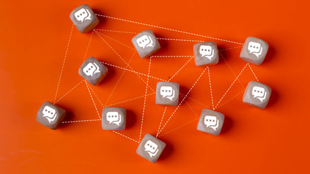 Concept of online communication or social networking. Wooden cubes with speech bubbles linked to each other with lines.