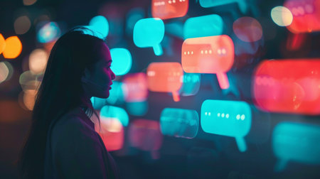 Young woman silhouetted against a backdrop of vibrant, glowing communication bubbles and blurred city lights, conveying digital interaction.