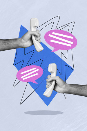 Vertical creative photo collage of two hands hold wire phone communication talk speech connection hotline support on drawing background