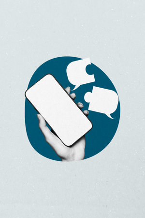 Pop zine sketch artwork collage of hand hold phone device puzzle match bubble communication message chat speech conversation