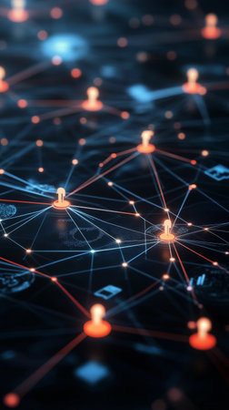 Stylized digital illustration of a complex neural network with glowing spheres and connecting lines on a dark background. Represents artificial intelligence, data science, and digital communication systems. Ideal for tech, innovation, and machine learning themes.