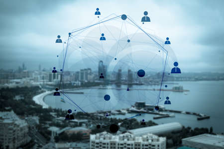 Abstract human connection on the beautiful modern city and seafront background.