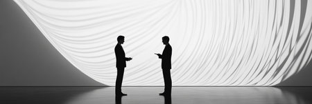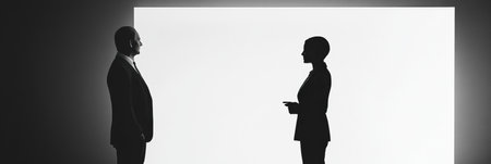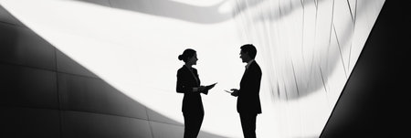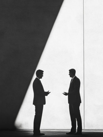 Two business professionals stand in profile, engaged in a thoughtful discussion under a bright white backdrop, highlighting their silhouettes.