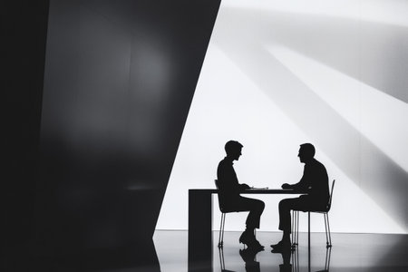 Two individuals are engaged in a negotiation at a minimalist table, silhouetted against a striking backdrop in an office setting.
