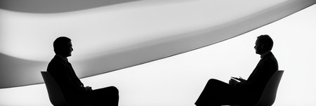 Silhouette of two people sitting and talking, discussing ideas, sharing thoughts, and communicating effectively.