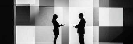 Two silhouetted figures engaged in negotiation in a contemporary space illuminated by soft light, creating an intriguing atmosphere.