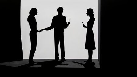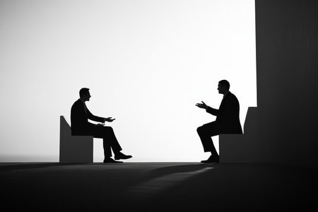 Two business professionals engage in a negotiation, their silhouettes contrasting against a bright background, emphasizing a minimalist style.