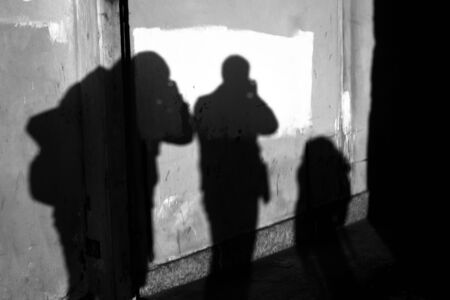 Photographer`s shadow. Shadow from a male photographer on a gray wall. shot of a self shadow of a photographer