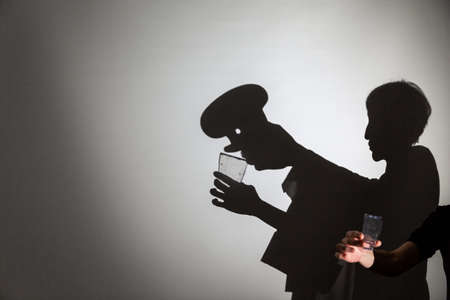 play shadow projected on a white screen. the person's hands shape a cook drinking from a glass