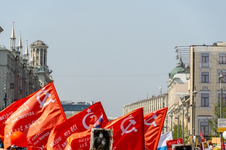 MOSCOW, RUSSIA - MAY 1, 2016: Unidentified Communist party supporters together with National Bolsheviks take part in a rally marking the May Day in the center of Moscow.
