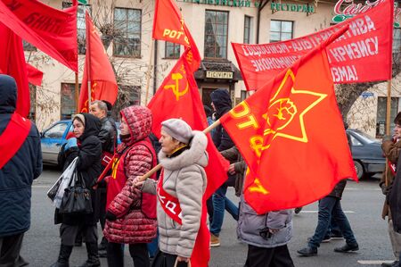 Tyumen, Russia - November 7, 2018: Demonstration on Respubliki Street and a meeting of communists in honor of 101 anniversaries of Great October socialist revolution