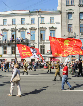 Soldiers with flags of the Soviet Union. Holiday-action Immortal regiment taking place in St. Petersburg on Nevsky Prospect.