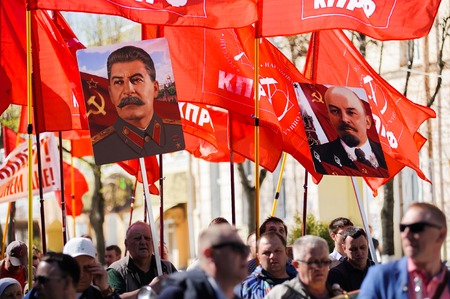 Orel, Russia - May 01, 2018: May Day demonstration. People walking with red communist flags, Lenin and Stalin portraits over heads