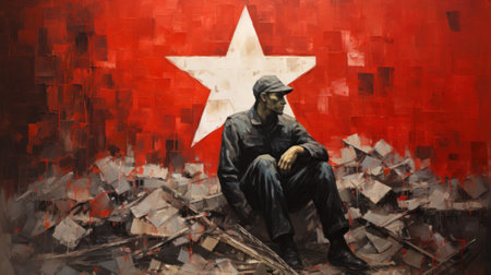 A painting of a man sitting on top of a pile of rubble. Generative AI image.