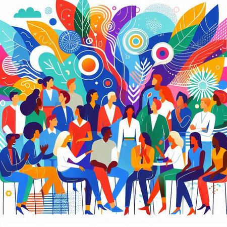 Large group of people in a circle. Multicolored background.