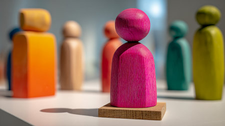 A vivid collection of handcrafted wooden figurines showcases a bold pink piece at the center, emphasizing the unique identity amidst a lively, multicolored lineup.