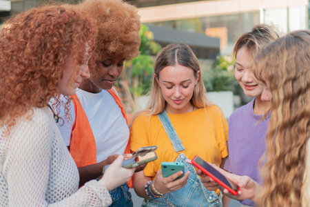 Group of diverse young friends excitedly sharing experiences while using colorful smartphones in a joyful and engaging atmosphere filled with laughter and connection