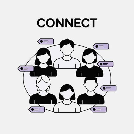Six stylized black and white person icons are arranged in a circle with lavender tags around them The word CONNECT is at the top. The style is simple and flat.